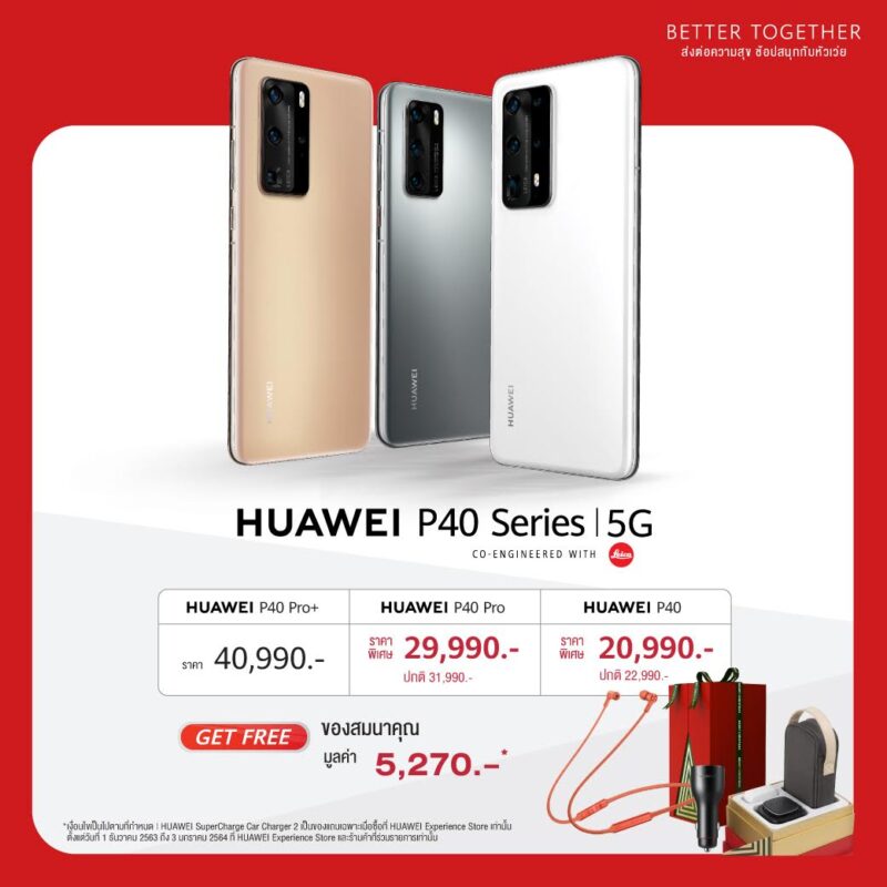 HUAWEI P40 Series มอบความเอ็กซ์คลูซีฟให้คนที่ซื้อช่วงปีใหม่นี้ ได้แก่ HUAWEI Freelace และกล่อง Entertainment Box รวมของขวัญให้คุณได้บันเทิงกับสมาร์ทโฟนคู่ใจเครื่องใหม่มูลค่า 5,270 บาท โดย HUAWEI P40 Pro+ สี Ceramic White จะจำหน่ายในราคา 40,990 บาท ส่วน HUAWEI P40 Pro และ HUAWEI P40 วางจำหน่ายราคาพิเศษ 29,990 บาท และ 20,990 บาทตามลำดับ มีให้เลือกถึง 5 สี คือ Silver Frost, Blush Gold, Deep Sea Blue, Ice White และ Black
