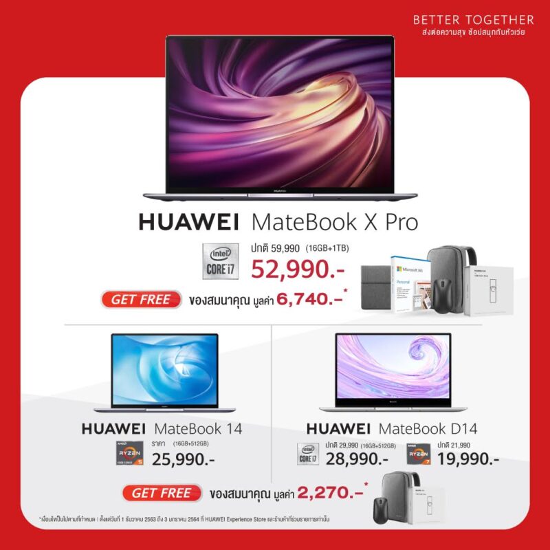 ใครที่ชอบแบบใช้ง่าย ราคาคุ้มค่า HUAWEI MateBook D14 ถ้าซื้อตอนนี้ แบบชิปเซ็ต i7 จะราคาพิเศษเพียง 28,990 ส่วน R7 เหลือเพียง 19,990 บาท ส่วนใครที่ชอบแบบแอดวานซ์ขึ้นมาหน่อย ทำได้หลายอย่างแบบอัจฉริยะด้วยจอ Multi-touch Screen ก็ลองแบบ HUAWEI MateBook 14 (R7) ราคา 25,990 สองรุ่นนี้จะมาพร้อมของสมนาคุณมูลค่ารวม 2,270 บาท ได้แก่ HUAWEI Laptop Bag และ HUAWEI Mouse และ USB Flash Drive ส่วนคนที่ต้องการฟีเจอร์แล็ปท็อปขึ้นสูงสุด งานละเอียดระดับ 4K ก็ทุ่มสุดตัวไปเลยกับ HUAWEI MateBook X Pro ราคาพิเศษ 52,990 พร้อมของสมนาคุณมูลค่ารวมถึง 6,740 บาท ได้แก่ Microsoft office 365, ซองใส่แล็ปท็อป, Mate Dock, HUAWEI Laptop Bag และ HUAWEI Mouse และ USB Flash Drive ถ้ามีอุปกรณ์ฟีเจอร์ครบมือตอบโจทย์ทุกอย่างชีวิตที่บริหารง่ายขึ้นก็อยู่ใกล้มือนิดเดียว