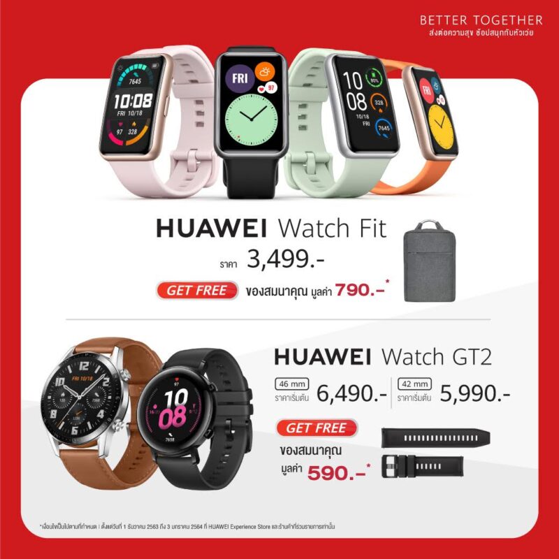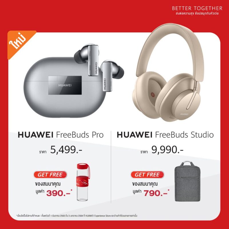 HUAWEI FreeBuds Pro พร้อมตอบโจทย์ด้วยราคา 5,499 บาท แถมฟรี ขวดน้ำแบบแอคทีฟ มูลค่า 390 บาท HUAWEI FreeBuds Studio มาในราคา 9,990 พร้อมกระเป๋าเป้สี Space Grey มูลค่า 790 บาท ทางด้านนาฬิกา HUAWEI Watch Fit ทั้ง 4 สี Graphite Black, Mint Green, Cantaloupe Orange และ Sakura Pink จำหน่ายในราคา 3,499 รับกระเป๋าเป้สี Space Grey มูลค่า 790 บาท และสุดท้าย HUAWEI Watch GT2 มี 2 ขนาดให้เลือก คือ 46mm (6,490 บาท) และ 42mm (5,990) บาท ฟรี HUAWEI Watch GT2 Strap ขนาด 22mm หรือ 20mm