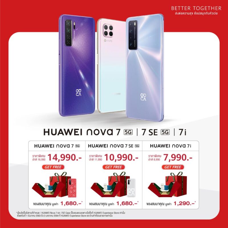 สำหรับวัยรุ่นแล้ว HUAWEI nova 7 Series คือไอเท็มที่ทำให้กลุ่มเพื่อนมีกิจกรรมรวมกันแบบสร้างสรรค์ได้มากขึ้น HUAWEI nova 7 และ HUAWEI nova 7 SE ใช้ชิปเซ็ต 5G แรงลื่นปรื๊ดเล่นเกมไม่สะดุด จะส่งวิดีโอวล็อกหากันเอง หรืออัพขึ้นบนโซเชียลมีเดียอย่าง Tiktok ก็ทำได้สนุกเพราะมีลูกเล่น DUAL View ถ่ายพร้อมกันกล้องหน้าและหลังได้ เผื่อใครอยากถ่าย Mukbang กินอาหารไปด้วยพร้อมรีแอคชันของตัวเอง แกล้งเพื่อนยามดึก หรือจะถ่ายคลิปเต้นแนวตั้ง ก็ใช้ Super Night Selfie 3.0 ถ่ายสวยๆ แถมยังมีข้อดีอีกอย่างคือสามารถ MeeTime หากันเองให้เห็นหน้ากันได้แบบเต็มที่ สีที่มีให้เลือกก็แล้วแต่สไตล์คนในกลุ่มเลย เพราะ HUAWEI nova 7 มีทั้งสีอินเทรนด์แบบ Midsummer Purple และ Space Silver ส่วน HUAWEI nova 7 se มาให้เลือกอีก 3 โทน ได้แก่ Crush Green, Space Silver และ Midsummer Purple วางจำหน่ายในราคาพิเศษ 14,990 บาท และ 10,990 บาท ตามลำดับ ซื้อปลายปีนี้ รับฟรีชุดของขวัญสุดพิเศษพร้อมเคส มูลค่ารวม 1,680 บาท