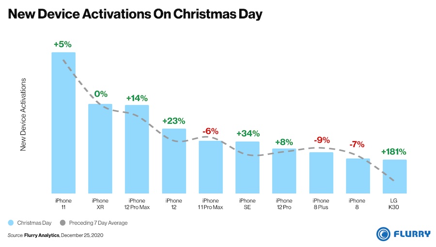 ข้อมูลจาก Flurry Analytics พบว่ามี iPhone มากถึง 9 รุ่น จาก 10 อันดับ ที่เป็นสมาร์ทโฟนเครื่องใหม่และถูกเปิดใช้งานในวันคริสต์มาสของสหรัฐอเมริกา ประกอบด้วย iPhone 11, iPhone XR, iPhone 12 Pro Max, iPhone 12, iPhone 11 Pro Max, iPhone SE, iPhone 12 Pro, iPhone 8 Plus, iPhone 8 และอันดับที่ 10 เป็น LG K30