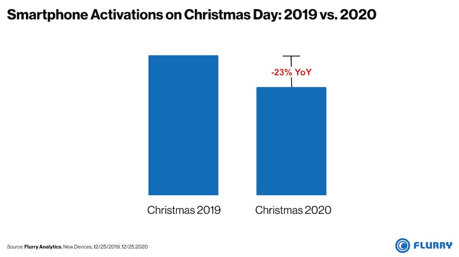 ทั้งนี้ Flurry Analytics ยังพบว่าจำนวนสมาร์ทโฟนเครื่องใหม่ในวันคริสต์มาสของสหรัฐอเมริกาในปี 2020 ลดลงถึง 23% เมื่อเทียบกับวันคริสต์มาสในปีที่แล้ว ซึ่งเป็นผลกระทบมาจากการระบาดของ COVID-19
