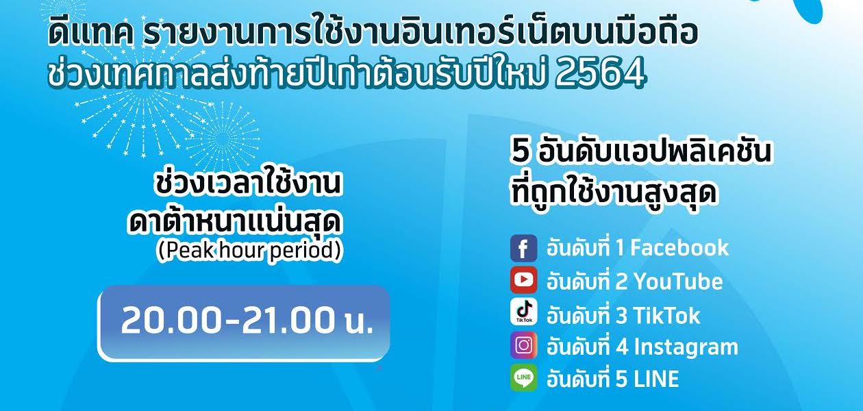 ดีแทคได้รายงานยอดการใช้งานอินเทอร์เน็ตบนมือถือในช่วงเทศกาลส่งท้ายปีเก่าต้อนรับปีใหม่ 2564 โดยมีข้อมูลน่าสนใจ ดังนี้
