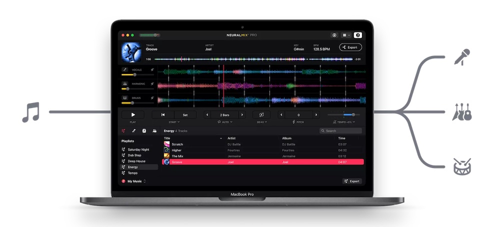 Neural Mix Pro เครื่องมือที่ยอดเยี่ยมสำหรับนักดนตรีและดีเจ สามารถแยกองค์ประกอบของเพลงได้อย่างละเอียด ทั้งเสียงร้อง, เครื่องดนตรี และ จังหวะ ซึ่งสามารถเปลี่ยนจังหวะของเพลงได้ โดยไม่ส่งผลกระทบกับเสียงแหลม