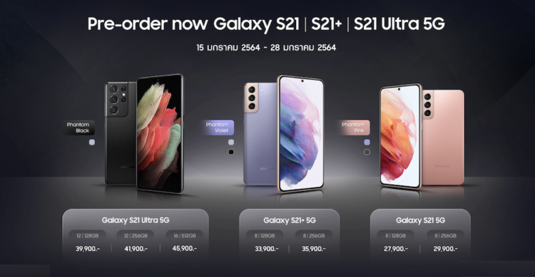 • Galaxy S21 5G มาใน 3 สี ได้แก่ Phantom Pink, Phantom Gray และ Phantom Violet ในราคาเริ่มต้นที่ 27,900 บาท