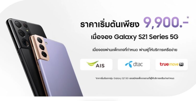 AIS เปิดรับจอง Samsung Galaxy S21 Series 5G ในระหว่างวันที่ 15 – 28 มกราคม 2564 พร้อมจัดส่งตั้งแต่วันที่ 27 มกราคม 2564 เป็นต้นไป โดยวางเงินมัดจำ 2,000 บาท ได้รับส่วนลดสูงสุด 22,000 บาท และสิทธิพิเศษมากมาย ตามรายการต่อไปนี้