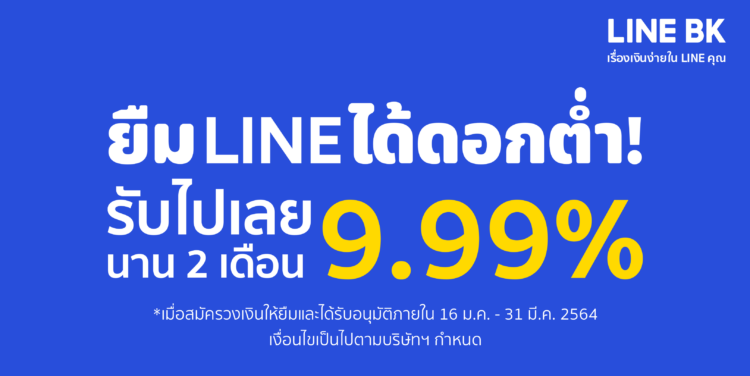 LINE BK เดินหน้าจับมือคนไทยสู้วิกฤติโควิด-19 เสริมสภาพคล่องทางการเงิน มอบโปรโมชั่นพิเศษสำหรับลูกค้าใหม่ เมื่อสมัครวงเงินให้ยืม และได้รับอนุมัติภายในวันที่ 16 มกราคม – 31 มีนาคม 2564 รับทันทีอัตราดอกเบี้ยพิเศษ 9.99% ต่อปี นาน 2 เดือน เพื่อช่วยบรรเทาปัญหาและเสริมสภาพคล่องทางการเงินให้แก่ผู้ที่อาจได้รับผลกระทบจากสถานการณ์การแพร่ระบาดของโควิด-19 รอบใหม่ ตอกย้ำจุดเด่น ยืม LINE ง่ายกว่า ไม่มีรายได้ประจำก็สามารถยืมได้ ทั้งอนุมัติไว ไม่ต้องใช้สลิปเงินเดือน และจะใช้วงเงินเมื่อไหร่ก็ได้