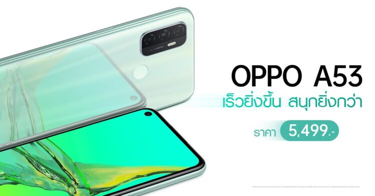 โดย OPPO A53 สมาร์ทโฟนที่สุดแห่งความคุ้มค่าพร้อมให้คุณ เร็วยิ่งขึ้น สนุกยิ่งกว่า ด้วยสีที่มีให้เลือก 2 สี คือ สีใหม่! สีเขียว Mint Cream และ สีดำ Moonlight Black ในราคาเพียง 5,499 บาท ที่ OPPO Brand Shop และตัวแทนจำหน่ายทั่วประเทศ
