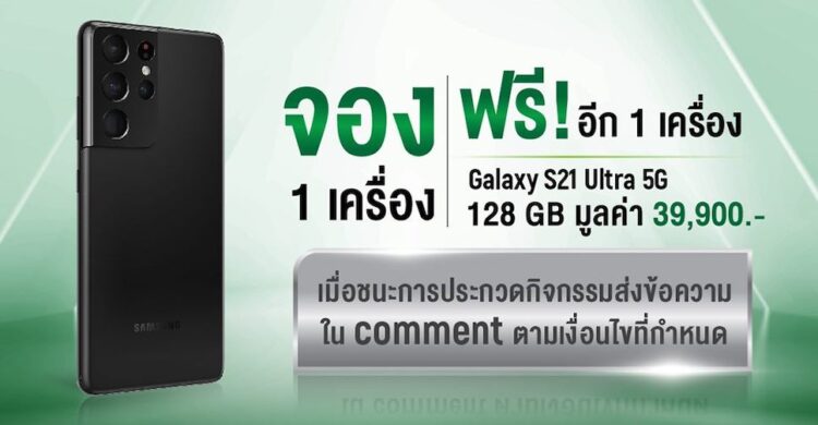 โดยคอมเมนต์นั้นต้องมีคนกด Like ตั้งแต่ 5 Like ขึ้นไป คอมเมนต์ที่ถูกใจคณะกรรมการ 21 ข้อความ จะได้รับรางวัล ฟรี Samsung Galaxy S21 Ultra 5G 128GB สีดำ มูลค่า 39,900 บาท จำนวน 21 รางวัล