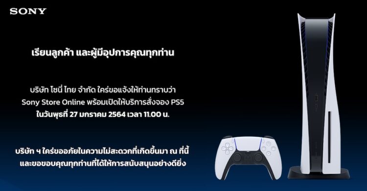 ล่าสุดทาง Sony Store Thailand ได้ออกมาประกาศแล้วว่า จะพร้อมเปิดให้ทำรายการสั่งจอง PlayStation 5 ทางออนไลน์อีกครั้ง ในวันพุธที่ 27 มกราคม 2564 เวลา 11.00 น. พร้อมกล่าวขอบคุณและขออภัยในความไม่สะดวกที่เกิดขึ้น