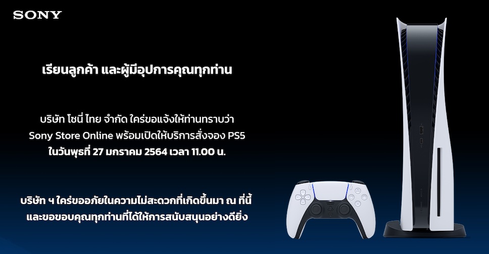 ด้วยกระปสตอบรับที่ดีเกินคาด ในวันแรกที่ Sony Store Thailand เปิดรับจองคอนโซลรุ่นใหม่ PlayStation 5 ในประเทศไทยเมื่อวันที่ 22 มกราคม ที่ผ่านมา ก็ส่งผลให้ระบบการจองเกิดปัญหาขัดข้อง เนื่องจากมีผู้สนใจเข้ามาทำรายการสั่งจองเป็นจำนวนมาก