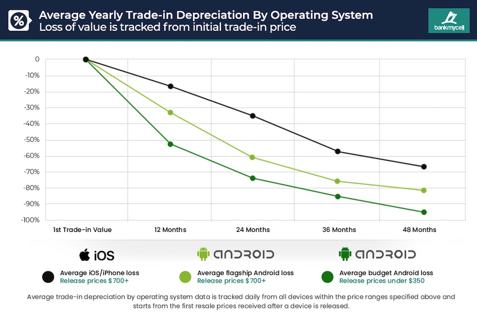 BankMyCell เว็บไซต์ซื้อขายแลกเปลี่ยนโทรศัพท์มือถือ ได้ทำรายงานประจำปีเกี่ยวมูลค่าสมาร์ทโฟนที่ลดลงหลังจากซื้อมาแล้ว โดยอาศัยข้อมูลจากการซื้อคืนสมาร์ทโฟนยอดนิยม 310 เครื่องต่อชั่วโมง ในระหว่างวันที่ 1 มกราคม – 31 ธันวาคม 2020 ซึ่งพบว่ามูลค่าของสมาร์ทโฟน Android หลังจากซื้อมาแล้ว ลดลงเร็วกว่า iPhone ถึง 2 เท่า