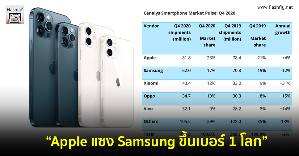 Apple ขึ้นแท่นเป็นผู้ผลิตสมาร์ทโฟนรายใหญ่ของโลก ในไตรมาสที่ 4 ปี 2020 อ้างอิงข้อมูลจากบริษัทวิจัยตลาด Canalys ซึ่งพบว่ายอดจัดส่งสมาร์ทโฟนของ Samsung และ Huawei ลดลงจากไตรมาสก่อนหน้า