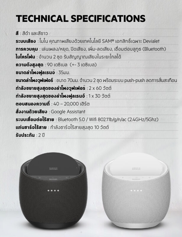 SOUNDFORM ELITE™ Hi-Fi Smart Speaker + Wireless Charger ลำโพงอัจฉริยะมาพร้อมเทคโนโลยีเสียงคุณภาพสูงระดับพรีเมียม (SPL สูงสุด 90dB SPL) กับเทคโนโลยีการชาร์จแบบไร้สายที่รวดเร็ว 10W อีกทั้งยังให้การทำงานร่วมกับ Google Voice Assistant ได้ด้วย ผู้ใช้งานสามารถชาร์จโทรศัพท์ขณะเล่นเพลง พร้อมสั่งงานด้วยคำสั่งเสียงไปยังลำโพงที่เปิดใช้งาน Google Assistant ได้ นอกจากนี้ยังสามารถใช้งานในแบบ Multi-room ได้ด้วยซึ่งจะเป็นการเชื่อมต่อลำโพงหลายตัวในเครือข่าย WiFi เดียวกันและสั่งงานผ่าน Google Assistant ให้ประสบการณ์การใช้งานหลายห้องที่สมจริง นอกจากนี้ยังสามารถควบคุมฟังก์ชั่นต่างๆภายในบ้านที่เป็นสมาร์ทโฮมด้วยการสั่งงานเสียงที่ทรงพลังและชัดเจน