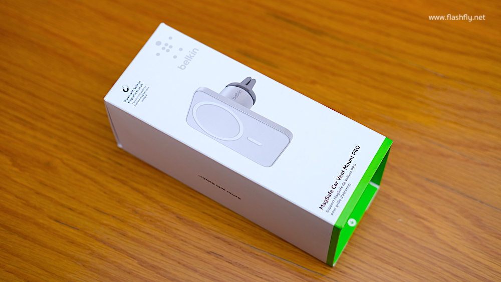 ตัวกล่องด้านในใช้สีเขียวนีออนที่ดูสดใส และแน่นอนว่ามี Belkin Car Vent Mount PRO พร้อม MagSafe ถูกจัดเก็บไว้ภายใน