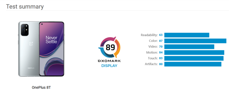 จากการทดสอบของ DxOMark ก็ได้ผลออกมาว่าจอ OnePlus 8T นั้นให้สีสันที่สวยสดใสและสัมผัสที่ลื่น สำหรับสเป็คของจอแสดงผลบน OnePlus 8T นั้นใช้จอ AMOLED คลุมด้วยกระจก Gorilla Glass 5 ขนาด 6.55 นิ้วที่มีอัตราส่วนจอกับเครื่องอยู่ที่ 87% ความละเอียดของจอคือ 2400 x 1080 พิกเซลและใช้อัตราส่วนจอที่ 20:9 ความหนาแน่นของพิกเซลอยู่ที่ 402 ppi และรองรับรีเฟรชเรตที่ 120Hz อีกด้วย