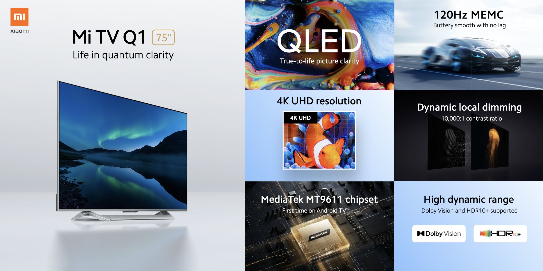 เสียวหมี่เปิดตัว Mi TV Q1 ขนาด 75 นิ้ว สมาร์ททีวีระดับพรีเมียม หน้าจอ QLED 4K เทคโนโลยี Quantum Dot ให้สีสันชัดสมจริง ด้วยระบบสี NTSC 100% ให้สีที่แม่นยำถึง 1.07 พันล้านเฉด ยกระดับประสบการณ์การรับชมไปอีกขั้นด้วยระบบภาพ Dolby Vision®️ ความละเอียดระดับ HDR10+ ระบบเสียงสเตอริโอด้วยลำโพง 30Wมากถึง 6 ตัวและยังรองรับระบบเสียงแบบ Dolby Audio และ DTS-HD อีกด้วย