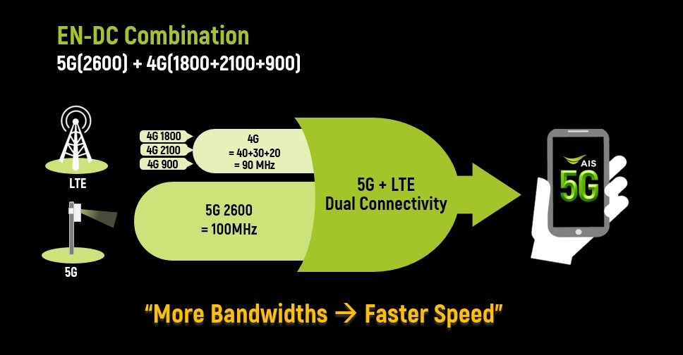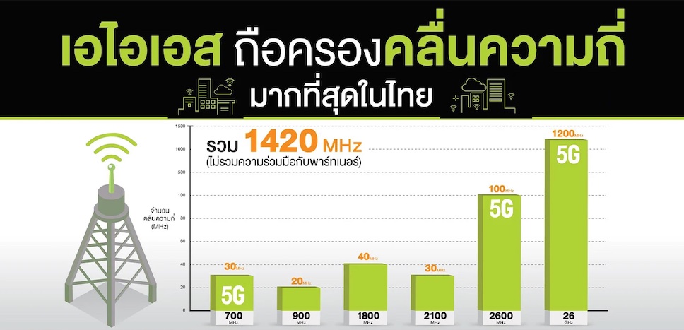 รวมแล้ว AIS มีจำนวนคลื่นมากที่สุดในประเทศไทยถึง 1420 MHz และด้วยจำนวนคลื่นความถี่ที่มากที่สุดแบบนี้ จึงทำให้การใช้งานเทคโนโลยี EN-DC (4G + 5G รวมกัน) ยิ่งได้ประสิทธิภาพมากขึ้นด้วย