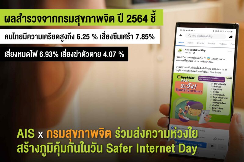 เอไอเอส ส่งความห่วงใยให้คนไทยยุคโควิด-19 ที่ใช้ชีวิตบนโลกออนไลน์ หลังผลสำรวจของกรมสุขภาพจิตในเดือนมกราคม ปี 2564 พบว่าประชาชนทั่วไปมีความเครียดสูง 6.25% มีภาวะเสี่ยงซึมเศร้า 7.85% มีภาวะเสี่ยงฆ่าตัวตาย 4.07% และมีภาวะเสี่ยงหมดไฟ 6.93%