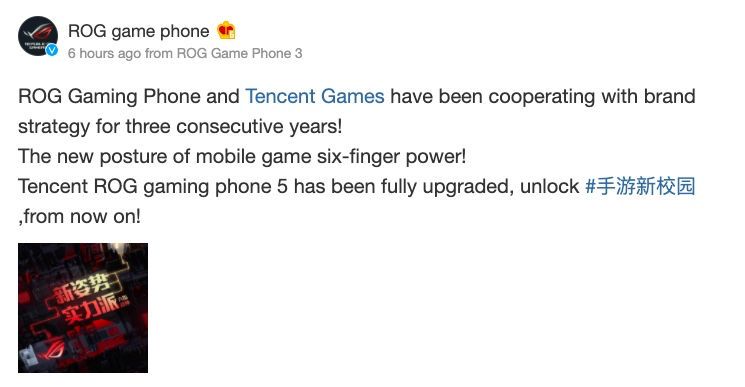 นอกจากจะออกมาเปิดเผยชื่อรุ่นร ASUS ยังประกาศว่า ROG Phone 5 ยังประกาศความร่วมมือกับ Tencent อีกครั้งในปีนี้