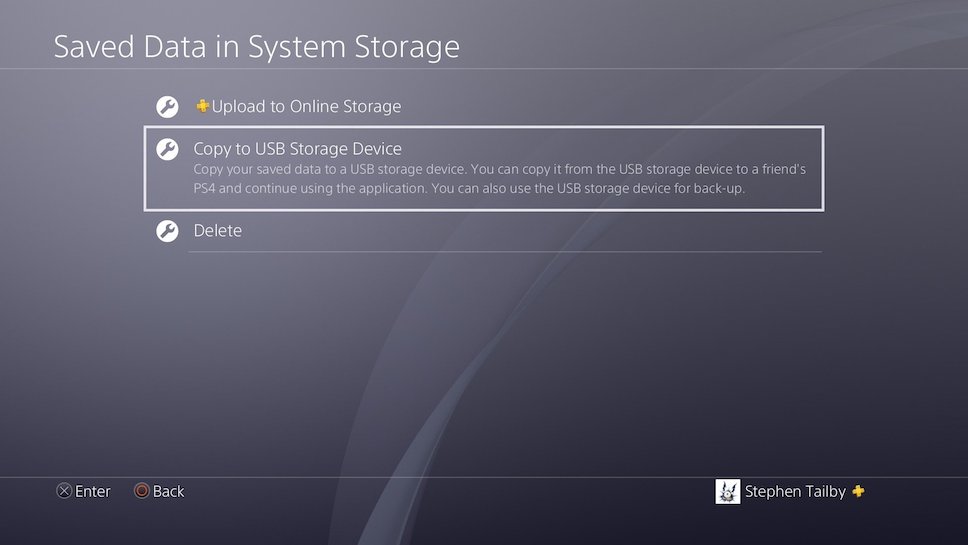 วิธีย้ายข้อมูลที่บันทึกไว้ผ่าน USB สามารภทำได้ง่ายๆ ด้วยอุปกรณ์จัดเก็บข้อมูลแบบ USB เช่น USB Flash Drive ให้เสียบเข้าไปที่ PlayStation 4 แล้วเข้าไปยัง Settings > Application Saved Data Management > Saved Data in System Storage > Copy to USB Storage Device จากนั้นเลือกไฟล์ที่ต้องการย้ายไปยังคอนโซลรุ่นใหม่