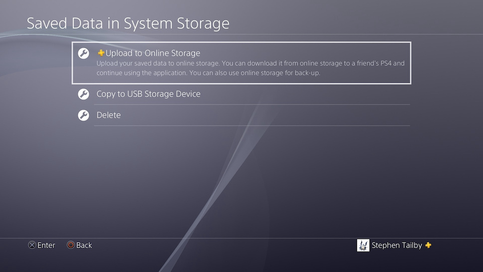 กรณีที่ผู้ใช้งานเป็นสมาชิก PlayStation Plus สามารถใช้วิธีย้ายข้อมูลผ่าน Cloud Storage ซึ่งเป็นวิธีที่สะดวกสบายกว่าการใช้อุปกรณ์ USB โดยเริ่มจากการย้ายข้อมูลที่บันทึกไว้ใน PlayStation 4 ไปเก็บยัง PlayStation Plus Cloud Storage เพียงเข้าไปที่ Settings > Application Saved Data Management > Saved Data in System Storage > Upload to Online Storage จากนั้นเลือกไฟล์ที่ต้องการย้าย รอให่้การย้ายเสร็๋จสิ้น ส่วนจะรอนานแค่ไหน ขึ้นอยู่กับความเร็วอินเตอร์เน็ต