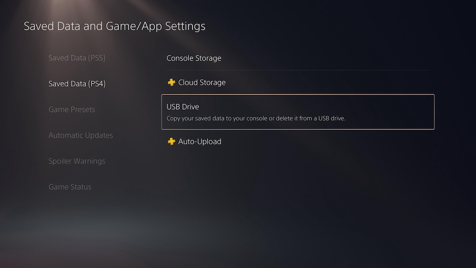 เมื่อย้ายข้อมูลที่บันทึกไว้ใน PlayStation 4 ไปยัง PlayStation Plus Cloud Storage เรียบร้อยแล้ว ให้สลับไปที่ PlayStation 5 แล้วเข้าไปที่ Settings > Saved Data and Game/App Settings > Saved Data (PS4) > Auto-Upload และเปิดให้ฟีเจอร์นี้ใช้งานได้ ซึ่งคอนโซลจะทำการย้ายจากคอนโซลรุ่นเก่า (ที่อัพโหลดไว้ใน Cloud Storage) ให้โดยอัตโนมัติ เมื่อคอนโซลอยู่ในโหมดสแตนด์บาย
