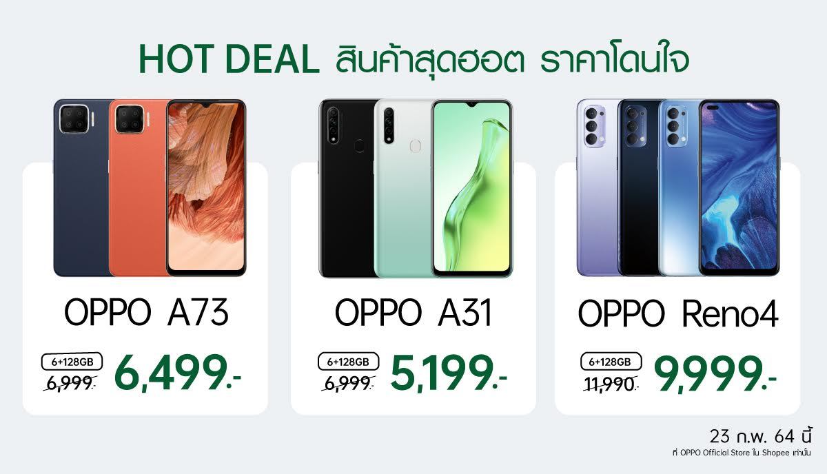 - Follow us! Voucher พิเศษเมื่อติดตาม OPPO Official Store ใน Shopee รับฟรี! คูปองส่วนลด 120 บาท เมื่อซื้อขั้นต่ำ 399 บาท โดยสามารถเก็บคูปองได้ภายในวันที่ 18 – 23 กุมภาพันธ์ 2564 และใช้ได้เฉพาะวันที่ 23 กุมภาพันธ์ 2564 เท่านั้น