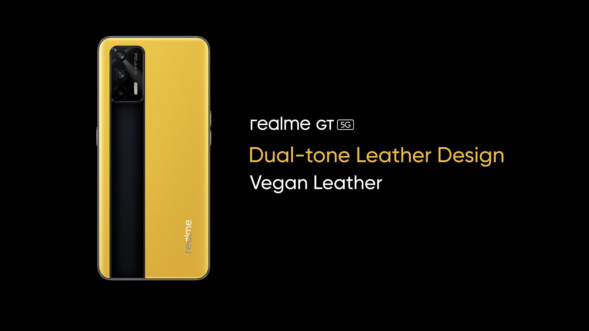 realme GT มีการออกแบบที่เป็นเอกลักษณ์และไม่เหมือนใคร ด้วยการออกโดยใช้หนังวีแกนแบบ Dual-tone ใช้วัสดุ 2 ชนิดที่แตกต่างกัน และใช้ 2 สีที่แตกต่างกัน ให้ความรู้สึกถึงความเร็วแรงดั่งประสิทธิภาพการทำงานระดับสูง realme ยังริเริ่มใช้กระบวนการขึ้นรูปชิ้นเดียวสำหรับฝาหลังและกรอบด้านในทำให้หนังวีแกนกระชับยิ่งขึ้น และตัดด้วยสีดำที่มีความมันวาวให้ความรู้สึกถึง “แทร็คในสนามแข่ง” ในขณะเดียวกัน realme อัพเกรดขั้นตอนการผลิตหนังวีแกนเป็นรุ่นที่ 2 ซึ่งจะมีความละเอียดอ่อน ให้สัมผัสที่นุ่มนวลมากยิ่งขึ้น และเอฟเฟกต์ของสีที่ชัดขึ้น