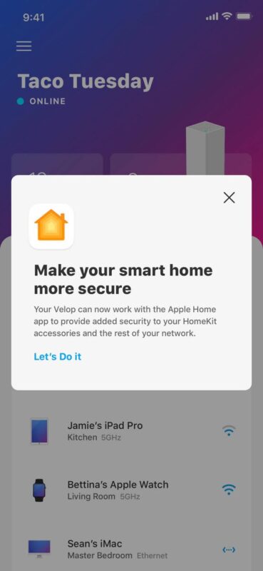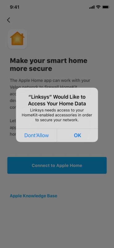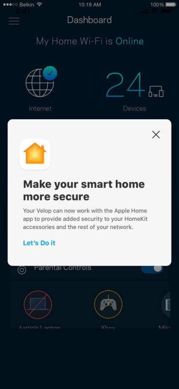 เมื่อใช้แอพพลิเคชั่น Home ที่มีบน iPhone, iPad และ Mac ลูกค้า Linksys ที่ใช้เราเตอร์ Linksys Velop Tri-Band Mesh จะสามารถจัดการการเข้าถึงอุปกรณ์เสริมที่เปิดใช้งาน HomeKit ได้อย่างปลอดภัย และสามารถกำหนดวิธีที่อุปกรณ์เสริมแต่ละชิ้นให้อนุญาตให้สามารถสื่อสารภายในบ้านและผ่านอินเทอร์เน็ต ทั้งนี้ HomeKit ได้รองรับการทำงานของ Linksys Velop Tri-Band Mesh ให้สามารถเชื่อมต่อกับอุปกรณ์ต่างๆใน HomeKit และป้องกันการเชื่อมต่ออุปกรณ์เหล่านั้นจากการสื่อสารกับอุปกรณ์ที่ใช้ Wi-Fi อื่น ๆ และการให้บริการที่ไม่น่าเชื่อถือผ่านทางอินเทอร์เน็ต