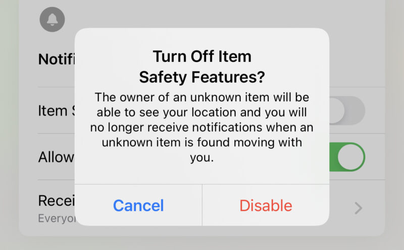 iOS 14.5 Beta 3 ก็มีฟีเจอร์ใหม่ที่ชื่อว่า “Item Safety Feature” สำหรับอุปกรณ์ติดตาม AirTags ที่สามารถกดหยุดการติดตามตำแหน่งได้