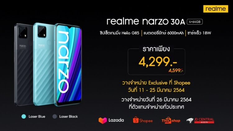 สำหรับสมาร์ทโฟนซีรีส์สำหรับเกมเมอร์โดยเฉพาะอย่าง realme narzo 30A ที่มาพร้อมชิปเซ็ตเกมมิ่งHelio G85 แบตเตอรี่ยักษ์ 6000 mAh และชาร์จเร็ว 18W สำหรับความจุ 4+64GB มาในราคาเพียง4,299 บาท โดยวางจำหน่าย Exclusive ผ่านช่องทาง Shopee ในวันที่ 11 ถึง 25 มีนาคมนี้เท่านั้น และสามารถเป็นเจ้าของได้พร้อมกันในวันที่ 26 มีนาคม 2564 ที่ realme Brand Shop และตัวแทนจำหน่ายทั่วประเทศ