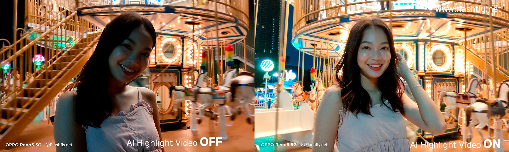 AI Highlight Video เป็นฟีเจอร์ที่ช่วยให้ผู้ใช้งาน OPPO Reno5 Series 5G สามารถถ่ายวิดีโอออกมาอย่างสวยงามคมชัดในทุกสภาพแสง โดยใช้ระบบจดจำสภาพแสงอัตโนมัติ และปรับค่าแสงเพื่อให้ได้วิดีโอที่มีคุณภาพสว่างชัดทุกจังหวะ พร้อมให้สีสันที่มีชีวิตชีวามากยิ่งขึ้นแม้ในที่แสงน้อยหรือย้อนแสง
