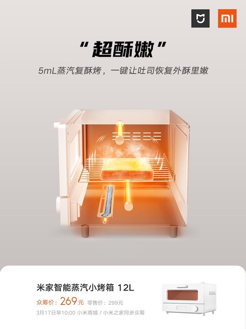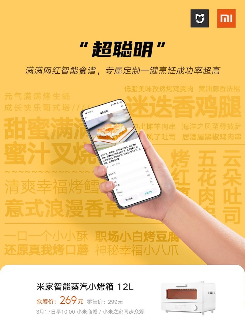 Xiaomi Home เปิดตัวเตาอบอัจฉริยะ Mijia Smart Steam Oven 12L ในรูปแบบระดมทุน ราคาเพียง 269 หยวน หรือราว 1,290 บาท โดยมีจุดเด่นที่ใช้เทคโนโลยีควบคุมอุณหภูมิอิเล็กทรอนิกส์อัจฉริยะ NTC สามารถควบคุมระดับการอบได้อย่างแม่นยำถึง 1 วินาที และควบคุมอุณหภูมิแม่นยำในระดับ 1 องศาเซลเซียส