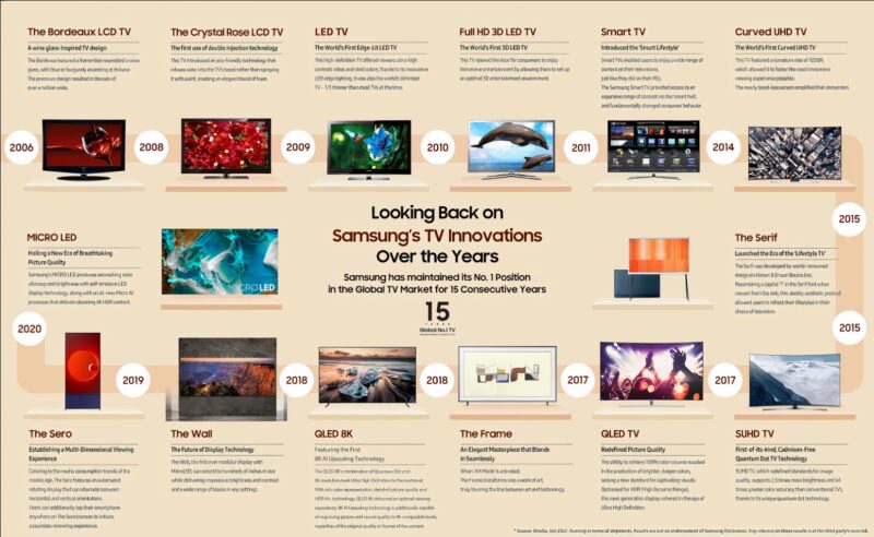 หากย้อนกลับไปในปี 2552 ซัมซุงนำเสนอเทคโนโลยีทีวี LED นวัตกรรมแหล่งกำเนิดแสงอัจฉริยะที่สร้างปรากฏการณ์ใหม่ในกลุ่มผลิตภัณฑ์ทีวี ต่อมาในปี 2560 ซัมซุงสร้างมาตรฐานใหม่ให้แก่อุตสาหกรรมทีวีอีกครั้งด้วยทีวี QLED ที่เนรมิตสีสันเต็มอิ่มแม่นยำทุกองศาได้อย่างสมบูรณ์แบบเป็นเจ้าแรกในตลาด รวมถึงเทคโนโลยี Quantum Dot ที่ให้สีสมจริงกว่าทีวีแบบเก่า พร้อมมีความเสถียรและแสงที่เจิดจ้าเต็มตา