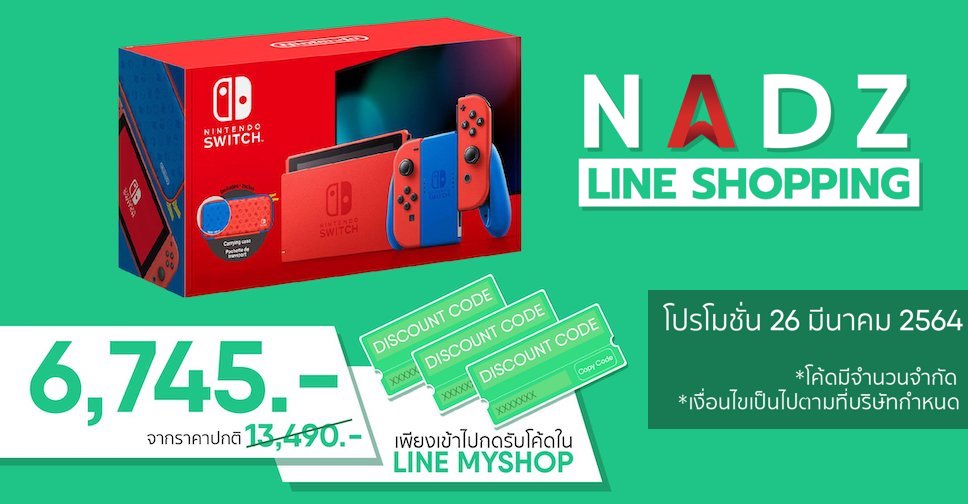 NADZ จะแจกโค้ดส่วนลด 50% สำหรับซื้อ Nintendo Switch Mario Red/Blue ในราคาพิเศษเพียง 6,745 บาท ผ่านทาง NADZ Line Shopping ในวันที่ 26 มีนาคม 2564 เวลา 00.00 น. – 23.59 น. โดยโค้ดส่วนลดมีจำนวนจำกัด หมดแล้วหมดเลย
