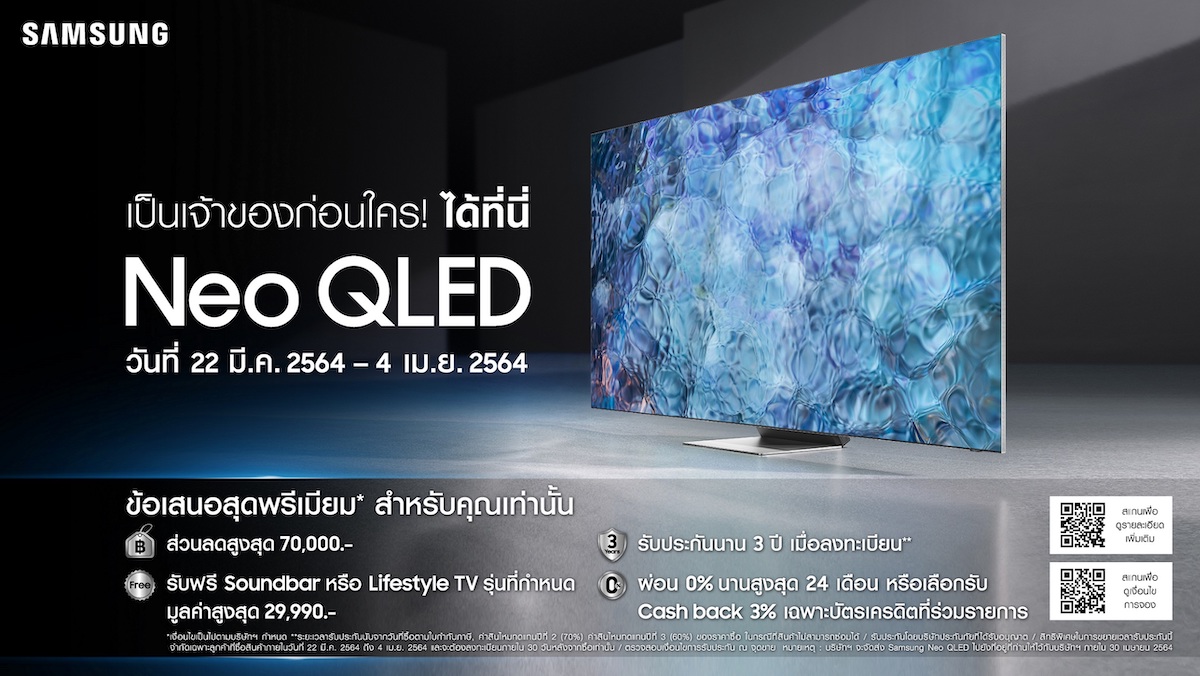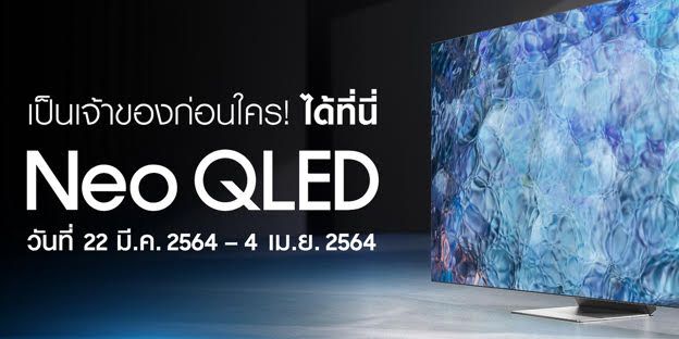 ไม่พลาดเป็นการเป็นเจ้าของ Neo QLED พร้อมโปรโมชั่นสุดพิเศษก่อนใครในประเทศไทย สามารถลงทะเบียนได้ที่ https://www.samsung.com/th/tvs/qled-tv/buy ตั้งแต่วันนี้ – 4 เมษายนนี้เท่านั้น