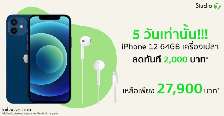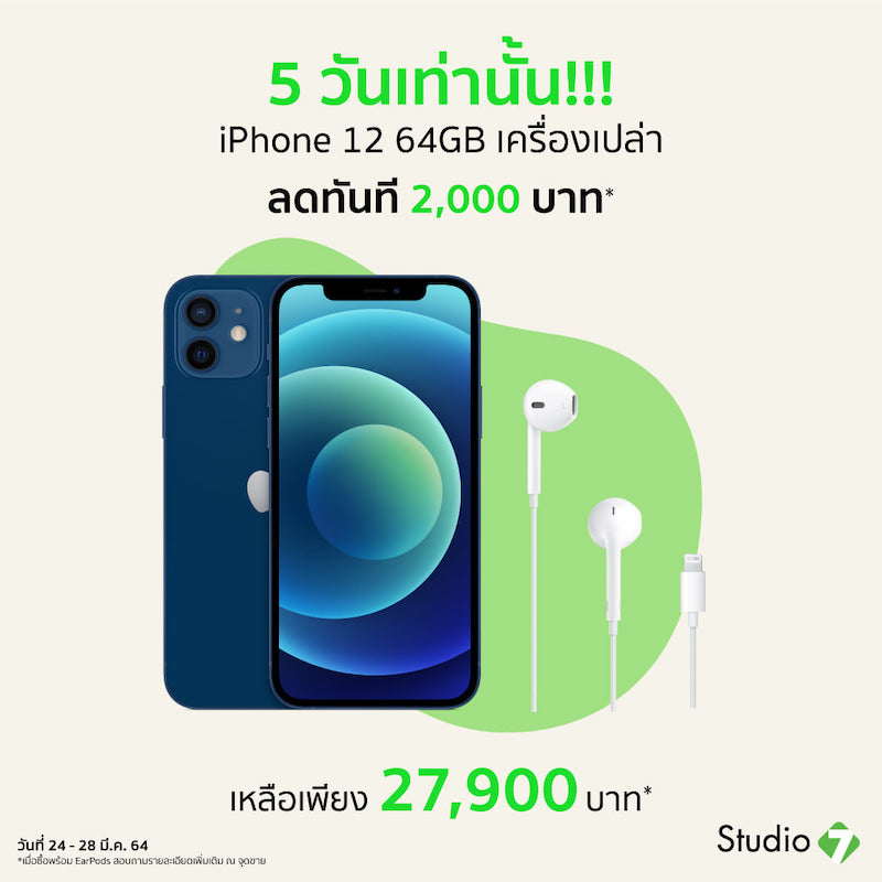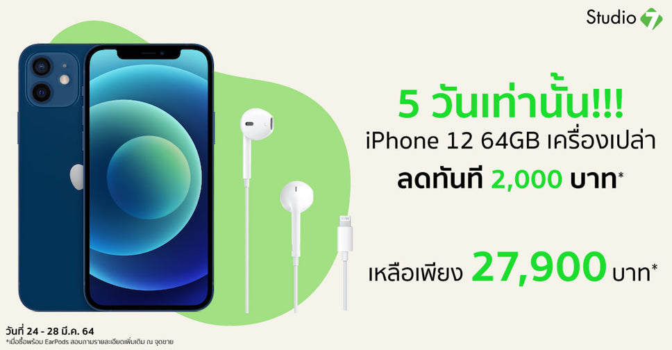 Studio 7 มอบส่วนลด 2,000 บาท เมื่อซื้อ iPhone 12 64GB พร้อม EarPods with Lightning Connector เหลือเพียง 27,900 บาท ที่ Studio 7 สาขาใกล้บ้าน ระหว่างวันที่ 24 – 31 มีนาคม 2564