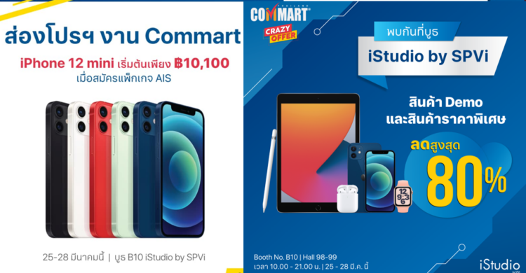 พบกับสินค้า Apple และ Accessories ราคาพิเศษ ลดสูงสุดถึง 80% พิเศษ iPhone12 mini ราคาเริ่มต้นเพียง 10,100 บาท เมื่อสมัครแพ็กเกจ AIS พบโปรโมชั่นพิเศษได้ที่งานคอมมาร์ท บูธ iStudio by SPVi (B10 / เสาที่ 40-41 ด้านหน้า) ตั้งแต่วันนี้ – 28 มีนาคม 2564 นี้ เวลา 10:00 – 21:00 น. ณ ไบเทค บางนา เท่านั้น