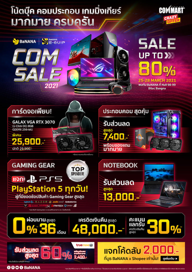 BaNANA จัดแตคมเปญ Come Sale ในงาน Commart 2021 แจก PlayStation 5 ทุกวัน สำหรับผู้ที่มียอดช้อปสินค้า Gaming Gear สูงสุดในแต่ละวัน (ลงทะเบียนลุ้นรับ PlayStation 5 ภายในงาน บริเวณข้าง Cashier กลาง) ระหว่างวันที่ 25 – 28 มีนาคม 2564 พบกันที่บูธ BaNANA Hall 98 – 99 Bitec Bangna
