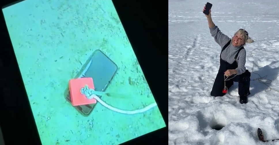 Angie Carriere กลับมากู้คืน iPhone 11 Pro ที่ทำตกไปในเดือนก่อน ด้วยการใช้แท่งแม่เหล็กมาเกี่ยวกับเชือกแล้วหย่อนลงไปคล้ายกับวิธีการตกปลาในทะเลสาบน้ำแข็ง และหลังจากใช้ความพยายามในการค้นหานานกว่า 2 ชั่วโมง เธอก็สามารถดึง iPhone ขึ้นมาได้