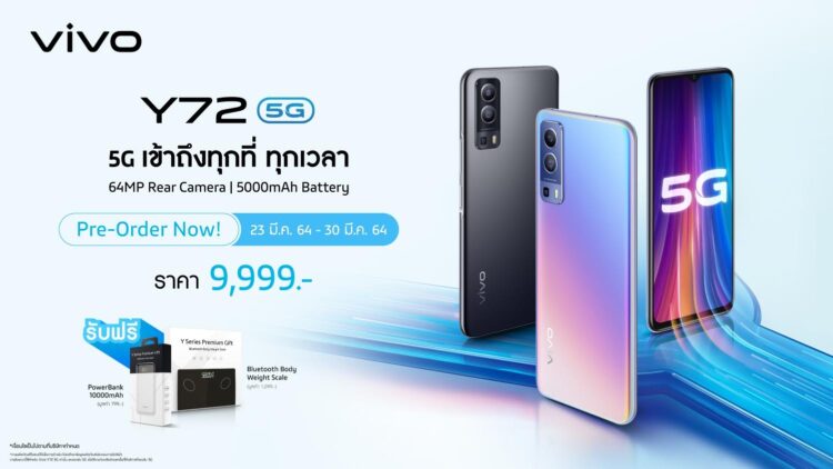หลังจากที่ Vivo แบรนด์สมาร์ตโฟนชั้นนำระดับโลก ประกาศเปิดตัว Vivo Y72 5G สมาร์ตโฟนรุ่นล่าสุดจากตระกูล Y Series ที่รองรับการเชื่อมต่อเครือข่าย 5G อย่างเป็นทางการไปแล้วในงาน Exclusive Online Launch ที่ราคา 9,999 บาท เปิดให้สั่งจองล่วงหน้าได้แล้วตั้งแต่วันนี้ ถึง 31 มีนาคม 2564 พร้อมรับของแถมสุดพิเศษมากมายจากทาง Vivo ทั้ง Bluetooth body weight scale มูลค่า 1,099 บาท และ Power Bank 10000mAh มูลค่า 799 บาท รับไปเลยทันที ฟรี! สำหรับผู้ที่สั่งจองตั้งแต่วันที่ 23 – 30 มีนาคม 2564 ณ Vivo Brand Shop ทุกสาขา ตัวแทนจำหน่ายทั่วประเทศ และช่องทางออนไลน์ Vivo Official Online Store ล่าสุดทาง Vivo ยังเตรียมส่งโปรโมชันเอาใจผู้ใช้งานชาวไทยให้ได้เป็นเจ้าของ Vivo Y72 5G ได้พิเศษกว่าที่เคย กับโปรโมชัน Pre-order และข้อเสนอสุดพิเศษจากร้านตัวแทนจำหน่ายชั้นนำ รวมทั้งผู้ให้บริการเครือข่าย 5G ที่ครอบคลุมทั่วประเทศ สั่งจอง Vivo Y72 5G วันนี้ รับสิทธิพิเศษพร้อมกันถึง 2 ต่อ ต่อที่ 1 ฟรีของแถมสุดพรีเมียมจากทาง Vivo[1] และต่อที่ 2 ข้อเสนอสุดพิเศษและของแถมแบบจัดเต็มจากหลากหลายช่องทาง โดยมีรายละเอียดดังต่อไปนี้