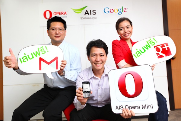 เอไอเอส โดยนายปรัธนา ลีลพนัง รักษาการผู้ช่วยกรรมการผู้อำนวยการอาวุโส ส่วนงานผลิตภัณฑ์และบริการดิจิตอล ร่วมกับ “Google” โดยนางสาวพรทิพย์ กองชุน หัวหน้าฝ่ายการตลาด ประจำประเทศไทย และ “โอเปร่าซอฟแวร์” โดยนายวิทมนต์ ภริตานนท์ ผู้อำนวยการฝ่ายพัฒนาธุรกิจ ประจำประเทศไทย เปิดประสบการณ์ใหม่สุดล้ำ เป็นครั้งแรกที่ให้ลูกค้าเอไอเอสกลุ่มคนรุ่นใหม่ นักเรียนนักศึกษา สนุกกับการใช้งาน Google+ และรับ-ส่ง Gmail บนมือถือได้ฟรี! โดยไม่คิดค่า EDGE/3G เพียงใช้งานผ่านบราวเซอร์ของโอเปร่า มินิ ซึ่งถือเป็นครั้งแรกของวงการ ในการผนึกกำลังกันของ 3 ค่ายยักษ์ใหญ่แห่งวงการไอที ร่วมกันสร้างสรรค์โมเดลพิเศษในการให้บริการ เพื่อให้ลูกค้าเอไอเอสได้สัมผัสกับประสบการณ์บนโลกออนไลน์ก่อนใคร