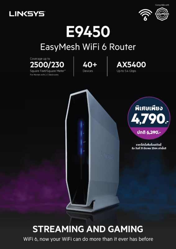 ลิงค์ซิส (Linksys) แบรนด์ชั้นนำเรื่องอุปกรณ์เน็ตเวิร์คภายในบ้าน (Connected Home) ของเบลคิน อินเตอร์เนชันแนล (Belkin International) และบริษัท ฟอกส์คอน อินเตอร์คอนเน็ค เทคโนโลยี (Foxconn Interconnect Technology: FIT) ที่ได้ควบรวมกิจการเข้าด้วยกัน ล่าสุดได้ประกาศเปิดตัวเราเตอร์ WiFi 6 เทคโนโลยี ที่มาพร้อมเทคโนโลยี EasyMesh ตัวแรกของ Linksys คือ Linksys E9450 WiFi 6 EasyMesh Router (AX5400) และเป็นครั้งแรกในการเปิดตัว EasyMesh ในเมืองไทยเพื่อให้ผู้ใช้งานอินเทอร์เน็ตระดับพื้นฐานเริ่มต้นใช้งานด้วยเราเตอร์สเปกสูงในราคาเข้าถึงได้