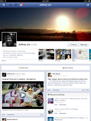 Facebook เวอร์ชั่น 5.0 จะสมบูรณ์แบบยิ่งขึ้นเมื่อใช้บน iPad ทั้งการแสดงผลที่ครบถ้วน ที่หน้า Wall ของเราจะเป็นแบบ Timeline สวยงาม ใส่ลูกเล่นเวลากด Comment ที่สเตตัส ก็จะเด้งขึ้นมาเป็นป็อปอัพสวยงาม