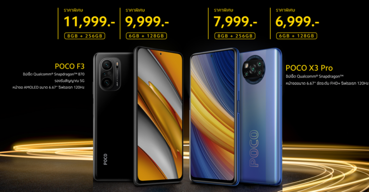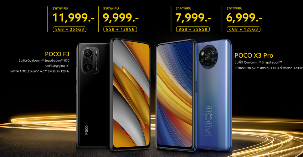 POCO ประเทศไทย ประกาศวางจำหน่าย POCO F3 สมาร์ทโฟน 5G สเปคแฟลกชิป ในราคาพิเศษเริ่มต้นเพียง 9,999 บาท และ POCO X3 Pro สมาร์ทโฟนสเปคแรงโดนใจกว่าเดิม ในราคาพิเศษเริ่มต้นเพียง 6,999 บาท โดยจับมือกับแพลตฟอร์มอีคอมเมิร์ซชั้นนำอย่าง JD Central และ Shopee เพื่อจัดจำหน่ายในราคาพิเศษในระหว่างวันที่ 1 – 8 เมษายน ก่อนที่จะวางจำหน่ายบนทุกแพลตฟอร์มอีคอมเมิร์ซและช่องทางออนไลน์ของตัวแทนจำหน่าย ในวันที่ 9 เมษายน 2564