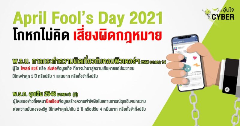 AIS อุ่นใจCyber ที่ให้ความสำคัญกับการส่งเสริมการใช้ออนไลน์อย่างถูกวิธี ในฐานะเพื่อนคู่คิดดิจิทัลของคนไทย จึงขอเป็นอีกหนึ่งพลังสำคัญร่วมเตือนคนไทยให้ใช้ออนไลน์อย่างมีสติ ไม่นำเข้าข้อมูลอันเป็นเท็จที่อาจจะก่อให้เกิดความเข้าใจผิด พร้อมกับเช็คข้อมูลให้ชัวร์ก่อนส่งต่อเสมอ โดยเฉพาะอย่างยิ่งในวันที่ 1 เมษายน เพราะไม่เช่นนั้นอาจเกิดความผิดฐานนำเข้าสู่ระบบคอมพิวเตอร์ซึ่งข้อมูลคอมพิวเตอร์อันเป็นเท็จ ตาม “พ.ร.บ.คอมพิวเตอร์ มาตรา 14 ปี 2560” ว่าด้วยการกระทำความผิดเกี่ยวกับคอมพิวเตอร์ฯ โดยการนําเข้าข้อมูลมีความบิดเบือน เป็นความจริงบางส่วน หรือไม่เป็นความจริงทั้งหมด โดยน่าจะเกิดความเสียหายแก่ประชาชน มีโทษจำคุก 5 ปี หรือปรับ 100,000 บาท หรือทั้งจำทั้งปรับ ผู้ส่งต่อมีอัตราโทษเท่ากัน  รวมถึง “พ.ร.ก. ฉุกเฉิน 2548 มาตรา 9 (3)” ที่ว่าห้ามเสนอข่าวที่มีข้อความอันอาจทำให้ประชาชนเกิดความหวาดกลัว หรือเจตนาบิดเบือนข้อมูลข่าวสาร ทำให้เกิดความเข้าใจผิด ในสถานการณ์ฉุกเฉิน จนกระทบต่อความมั่นคงของรัฐ หรือ ความสงบเรียบร้อย หรือศีลธรรมอันดีของประชาชน ทั้งในเขตพื้นที่ที่ประกาศสถานการณ์ฉุกเฉิน หรือทั่วราชอาณาจักรมีโทษจำคุกไม่เกิน 2 ปี หรือปรับไม่เกิน 40,000 บาท หรือทั้งจำทั้งปรับ