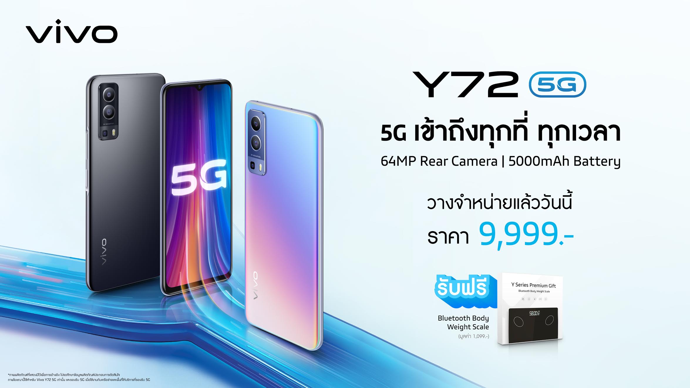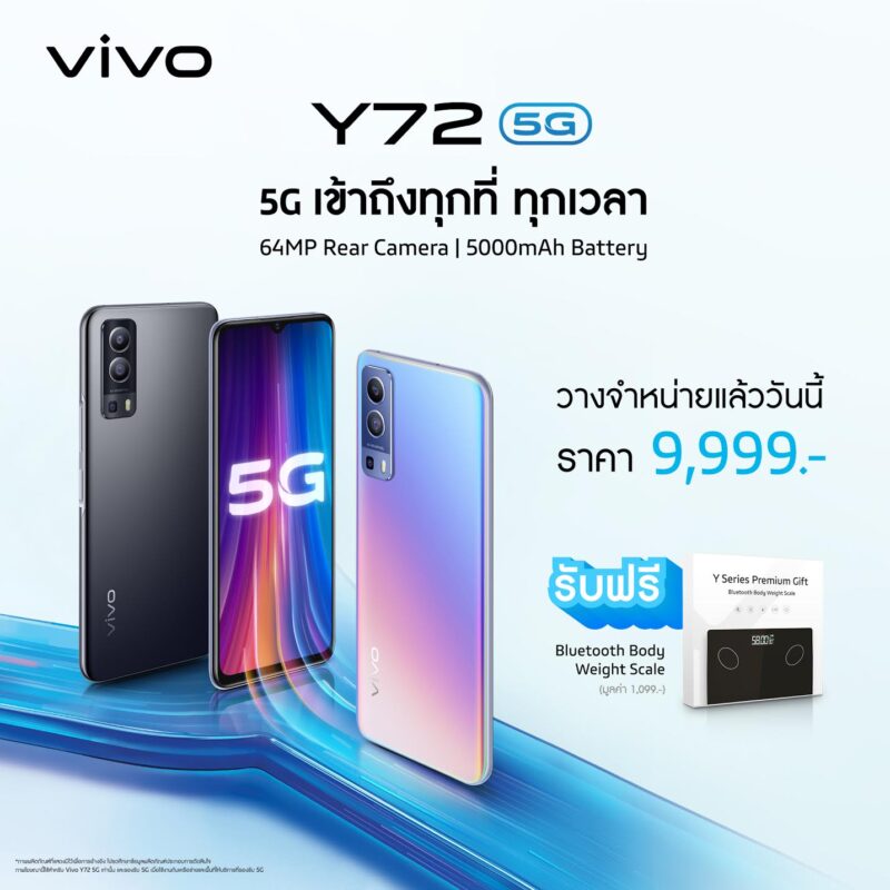 Vivo Y72 5G เปิดให้เป็นเจ้าของได้แล้ววันนี้ ที่ Vivo Brand Shop ทุกสาขา และตัวแทนจำหน่ายทั่วประเทศพร้อมรับฟรี! ของแถมสุดพิเศษ Bluetooth body weight scale มูลค่า 1,099 บาท ติดตามรายละเอียดเพิ่มเติมได้ที่https://www.vivo.com/th