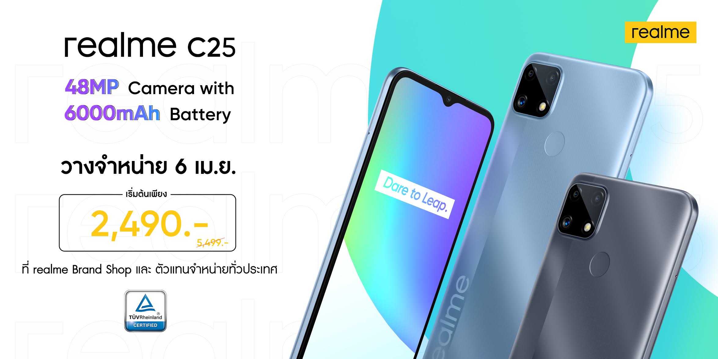 realme แบรนด์สมาร์ทโฟนเพื่อคนรุ่นใหม่ที่เติบโตเร็วที่สุดในโลก วางจำหน่าย realme C25 ‘กล้อง 48 MP แบต 6000 mAh’ สมาร์ทโฟนที่มาพร้อมกับกล้องหลัง 3 เลนส์ ความละเอียด 48 ล้านพิกเซล ชิปเซ็ตเกมมิ่ง Helio G70 แบตเตอรี่ 6000 มิลลิแอมป์ พร้อมชาร์จเร็ว 18 วัตถ์ และการรับรองคุณภาพจาก TUV Rheinland Certified โดยมากับความจุ 4+64 GB ในราคาเริ่มต้นเพียง 2,490 บาท จากปกติ 5,499 บาท สามารถเป็นเจ้าของพร้อมกันทั่วประเทศ ที่ realme Brand Shop และตัวแทนจำหน่าย ในวันที่ 6 เมษายนนี้