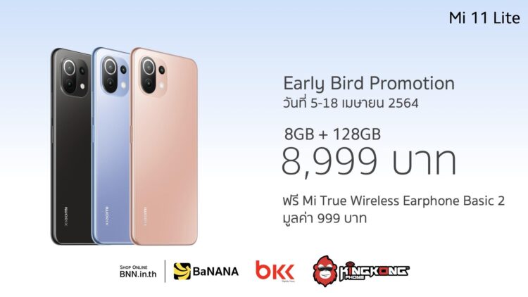 Mi 11 Lite เริ่มวางจำหน่ายตั้งแต่ 5 เมษายน 2564 ที่ร้านค้าในเครือ Com 7 เท่านั้น ได้แก่ BaNANA, BNN.in.th, BKK และ KingKong Phone ในราคา 8,999 บาท (RAM 8GB + ROM 128 GB) พิเศษ! สำหรับผู้ซื้อระหว่าง 5-18 เมษายนนี้ รับ Mi True Wireless Earphone Basic 2 มูลค่า 999 บาท ฟรีทันที